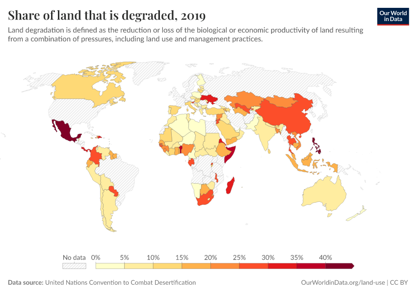 United Nations Convention to Combat Desertification – processed by Our World in Data. “Share of land that is degraded” [dataset]. United Nations Convention to Combat Desertification, “Data from multiple sources” [original data]. Retrieved March 13, 2026 from https://admin-refresh-dis.owid.pages.dev/grapher/share-degraded-land