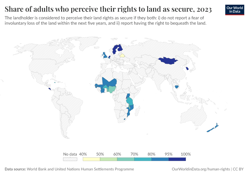 World Bank and United Nations Human Settlements Programme – processed by Our World in Data. “Share of adults who perceive their rights to land as secure” [dataset]. World Bank and United Nations Human Settlements Programme, “Data from multiple sources” [original data]. Retrieved March 13, 2026 from https://admin-refresh-dis.owid.pages.dev/grapher/share-of-adults-who-perceive-their-rights-to-land-as-secure