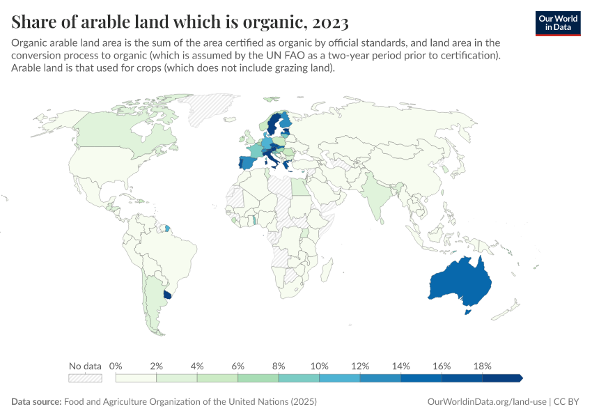 Food and Agriculture Organization of the United Nations (2025) – with major processing by Our World in Data. “Share of arable land that is organic – UN FAO” [dataset]. Food and Agriculture Organization of the United Nations, “Land, Inputs and Sustainability: Land Use” [original data]. Retrieved March 13, 2026 from https://admin-refresh-dis.owid.pages.dev/grapher/share-of-arable-land-which-is-organic
