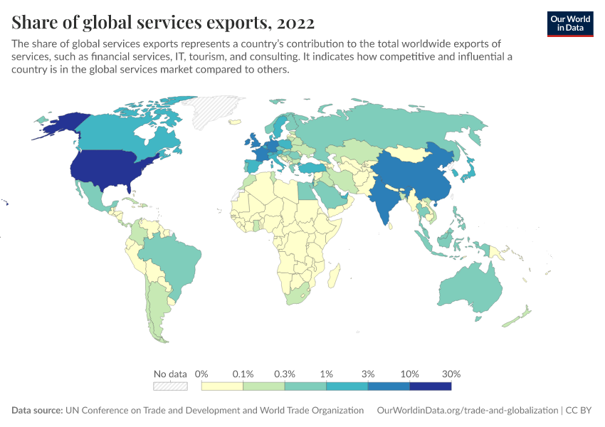 “Data Page: Share of global services exports”. Our World in Data (2026). Data adapted from UN Conference on Trade and Development and World Trade Organization. Retrieved from https://admin-refresh-dis.owid.pages.dev/grapher/share-of-global-services-exports [online resource]How to cite this data