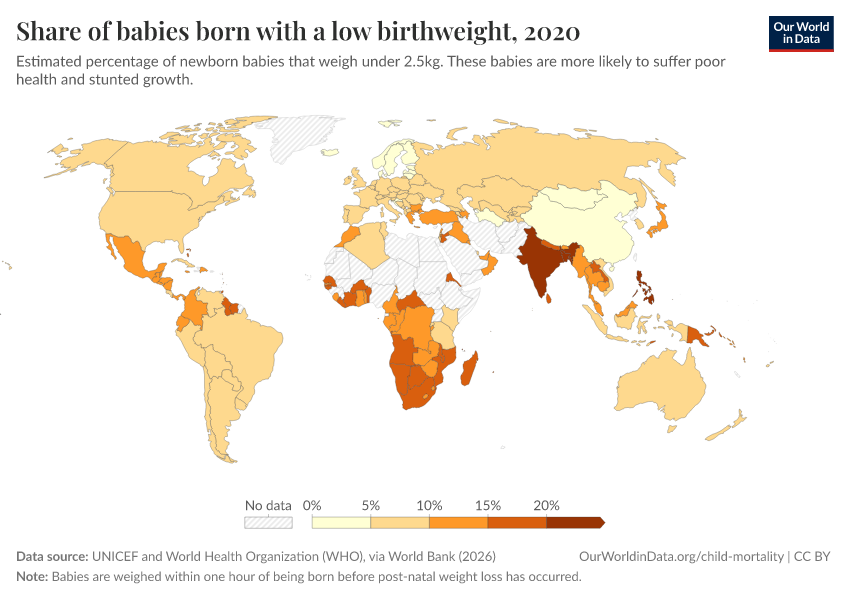 “Data Page: Share of babies born with a low birthweight”. Our World in Data (2026). Data adapted from UNICEF and World Health Organization (WHO), via World Bank. Retrieved from https://admin-refresh-dis.owid.pages.dev/grapher/share-of-low-birthweight-babies-born [online resource]How to cite this data