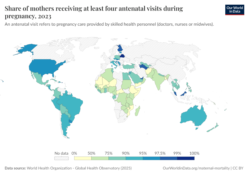 World Health Organization - Global Health Observatory (2025) – processed by Our World in Data. “Share of mothers receiving at least four antenatal visits during pregnancy” [dataset]. World Health Organization, “Global Health Observatory” [original data]. Retrieved March 13, 2026 from https://admin-refresh-dis.owid.pages.dev/grapher/share-of-mothers-receiving-at-least-four-antenatal-visits-during-pregnancy