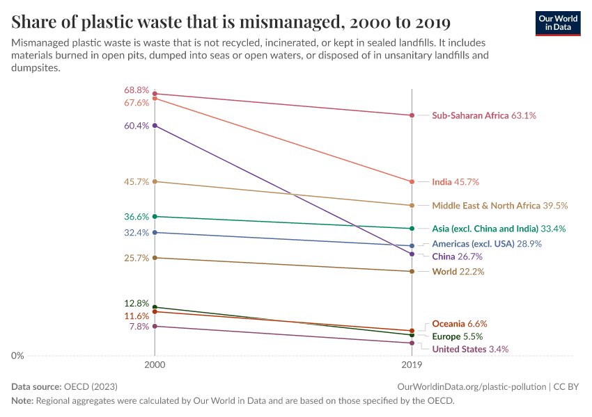 “Data Page: Share of plastic waste that is mismanaged”, part of the following publication: Hannah Ritchie, Veronika Samborska, and Max Roser (2023) - “Plastic Pollution”. Data adapted from OECD. Retrieved from https://admin-refresh-dis.owid.pages.dev/grapher/share-of-plastic-waste-that-is-mismanaged [online resource]How to cite this data