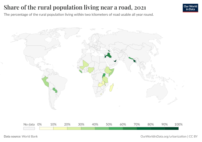 World Bank – processed by Our World in Data. “Share of the rural population living near a road” [dataset]. World Bank, “Data from multiple sources” [original data]. Retrieved March 13, 2026 from https://admin-refresh-dis.owid.pages.dev/grapher/share-of-rural-population-near-a-road