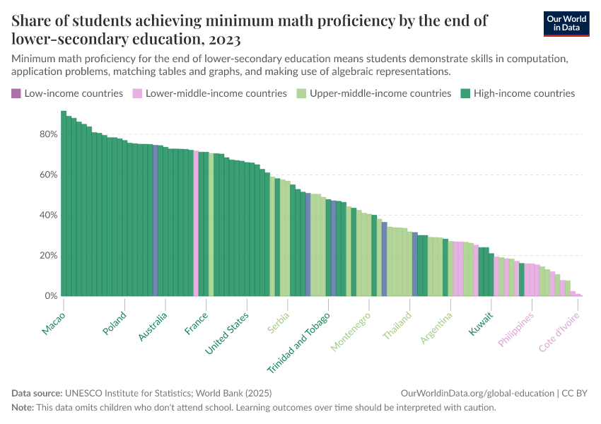 UNESCO Institute for Statistics – processed by Our World in Data. “Share of students achieving minimum math proficiency by the end of lower-secondary education” [dataset]. UNESCO Institute for Statistics, “Data from multiple sources” [original data]. Retrieved March 13, 2026 from https://admin-refresh-dis.owid.pages.dev/grapher/share-of-students-at-end-of-lower-secondary-education-achieving-minimum-math-proficiency