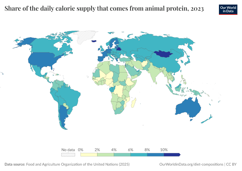 “Data Page: Share of the daily calorie supply that comes from animal protein”, part of the following publication: Hannah Ritchie, Pablo Rosado, and Max Roser (2023) - “Agricultural Production”. Data adapted from Food and Agriculture Organization of the United Nations. Retrieved from https://admin-refresh-dis.owid.pages.dev/grapher/share-of-the-daily-calorie-supply-that-comes-from-animal-protein [online resource]How to cite this data