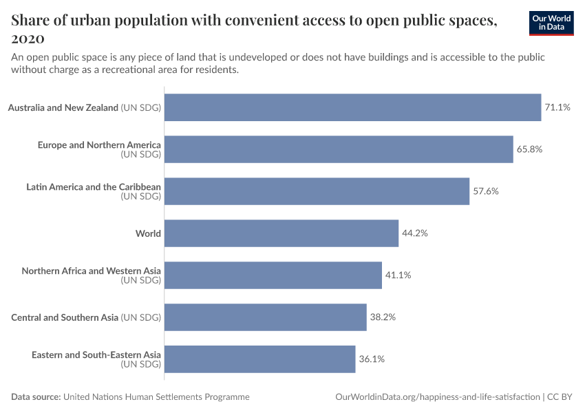 United Nations Human Settlements Programme – processed by Our World in Data. “Share of urban population with convenient access to open public spaces” [dataset]. United Nations Human Settlements Programme, “Data from multiple sources” [original data]. Retrieved March 13, 2026 from https://admin-refresh-dis.owid.pages.dev/grapher/share-of-urban-population-with-convenient-access-to-open-public-spaces