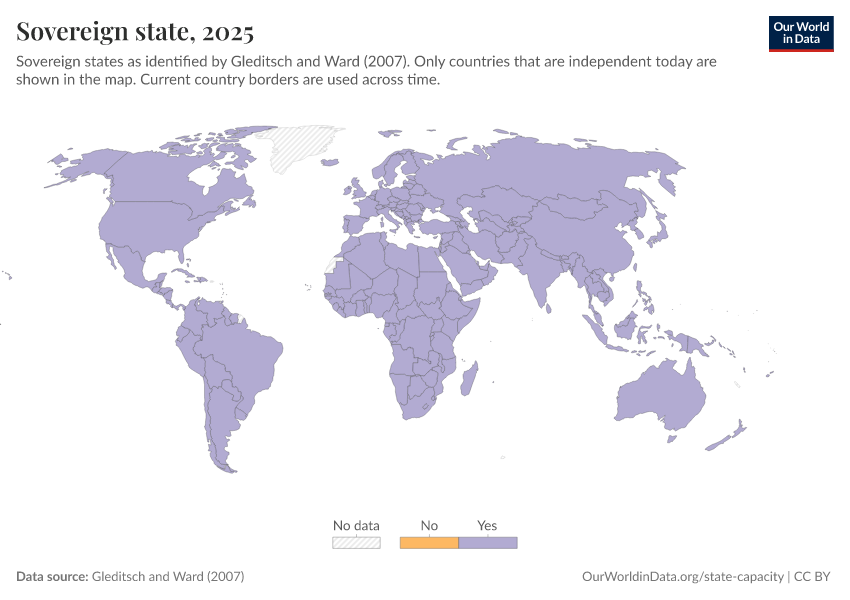 “Data Page: Sovereign state”, part of the following publication: Bastian Herre and Pablo Arriagada (2023) - “State Capacity”. Data adapted from Gleditsch and Ward. Retrieved from https://admin-refresh-dis.owid.pages.dev/grapher/sovereign-state-gleditsch-ward [online resource]How to cite this data