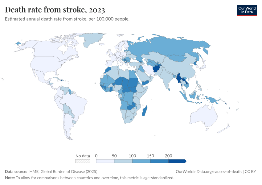 IHME, Global Burden of Disease (2025) – with major processing by Our World in Data. “Death rate from stroke” [dataset]. IHME, Global Burden of Disease, “Global Burden of Disease - Deaths” [original data]. Retrieved March 13, 2026 from https://admin-refresh-dis.owid.pages.dev/grapher/stroke-death-rates