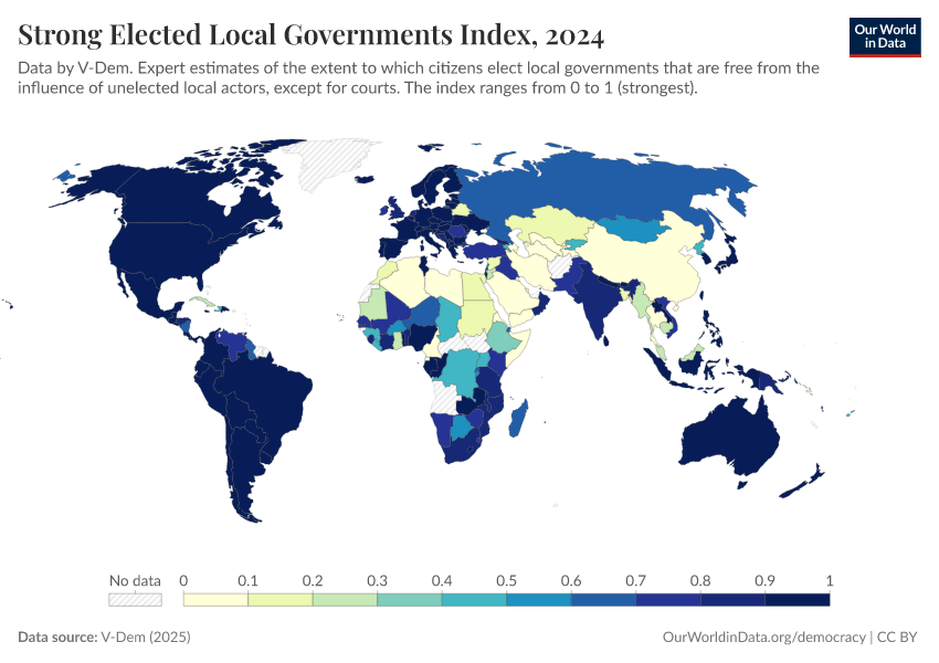 “Data Page: Elected local governments”, part of the following publication: Bastian Herre, Lucas Rodés-Guirao, and Esteban Ortiz-Ospina (2013) - “Democracy”. Data adapted from V-Dem. Retrieved from https://admin-refresh-dis.owid.pages.dev/grapher/strong-elected-local-governments-index [online resource]How to cite this data