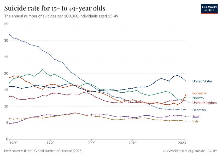 IHME, Global Burden of Disease (2025) – with major processing by Our World in Data. “Suicide rate for 15- to 49-year olds” [dataset]. IHME, Global Burden of Disease, “Global Burden of Disease - Deaths” [original data]. Retrieved March 13, 2026 from https://admin-refresh-dis.owid.pages.dev/grapher/suicide-rate-for-15--to-49-year-olds