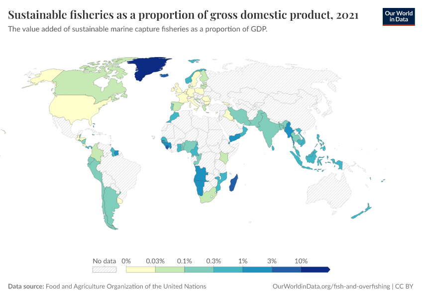 Food and Agriculture Organization of the United Nations – processed by Our World in Data. “Sustainable fisheries as a proportion of gross domestic product” [dataset]. Food and Agriculture Organization of the United Nations, “Official country reported data (UNSD and OECD national accounts). FAO Yearbook of Fishery Statistics and Review of the State of World Marine Fishery Resources.” [original data]. Retrieved March 13, 2026 from https://admin-refresh-dis.owid.pages.dev/grapher/sustainable-fisheries-as-a-proportion-of-gdp