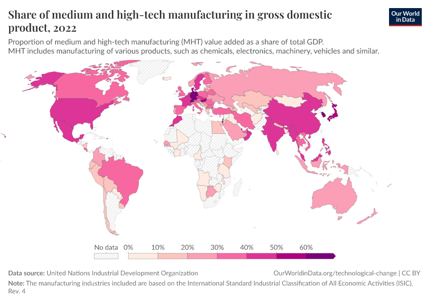 United Nations Industrial Development Organization – processed by Our World in Data. “Share of medium and high-tech manufacturing in gross domestic product” [dataset]. United Nations Industrial Development Organization, “UNIDO INDSTAT Database. Available at https://stat.unido.org” [original data]. Retrieved March 13, 2026 from https://admin-refresh-dis.owid.pages.dev/grapher/total-manufacturing-value-added-from-high-tech