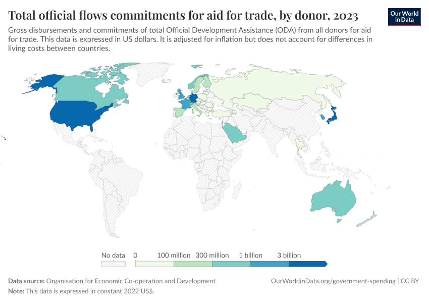 Organisation for Economic Co-operation and Development – processed by Our World in Data. “Total official flows commitments for aid for trade, by donor” [dataset]. Organisation for Economic Co-operation and Development, “The Organisation for Economic Co-operation and Development (OECD).” [original data]. Retrieved March 13, 2026 from https://admin-refresh-dis.owid.pages.dev/grapher/total-oda-for-aid-for-trade-by-donor