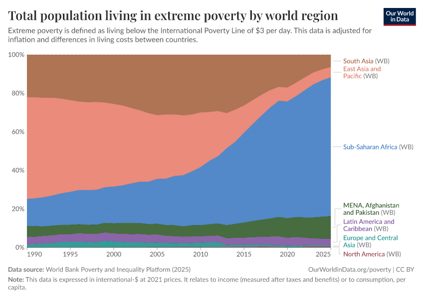 World Bank Poverty and Inequality Platform (2025) – with major processing by Our World in Data. “Total population living in extreme poverty by world region – World Bank” [dataset]. World Bank Poverty and Inequality Platform, “World Bank Poverty and Inequality Platform (PIP) 20250930_2021, 20250930_2017” [original data]. Retrieved March 13, 2026 from https://admin-refresh-dis.owid.pages.dev/grapher/total-population-living-in-extreme-poverty-by-world-region