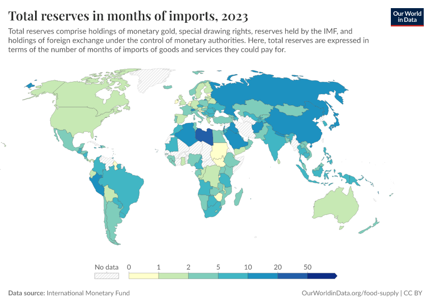 International Monetary Fund – processed by Our World in Data. “Total reserves in months of imports” [dataset]. International Monetary Fund, “International Monetary Fund, International Financial Statistics and data files.” [original data]. Retrieved March 13, 2026 from https://admin-refresh-dis.owid.pages.dev/grapher/total-reserves-in-months-of-imports