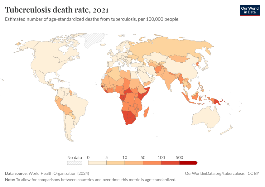 World Health Organization (2024) – with major processing by Our World in Data. “Tuberculosis death rate” [dataset]. World Health Organization, “Global Health Estimates” [original data]. Retrieved March 13, 2026 from https://admin-refresh-dis.owid.pages.dev/grapher/tuberculosis-death-rate-age-standardized