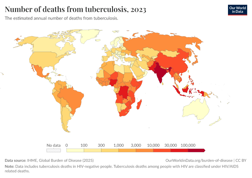 “Data Page: Number of deaths from tuberculosis”, part of the following publication: Esteban Ortiz-Ospina and Max Roser (2016) - “Global Health”. Data adapted from IHME, Global Burden of Disease. Retrieved from https://admin-refresh-dis.owid.pages.dev/grapher/tuberculosis-deaths [online resource]How to cite this data