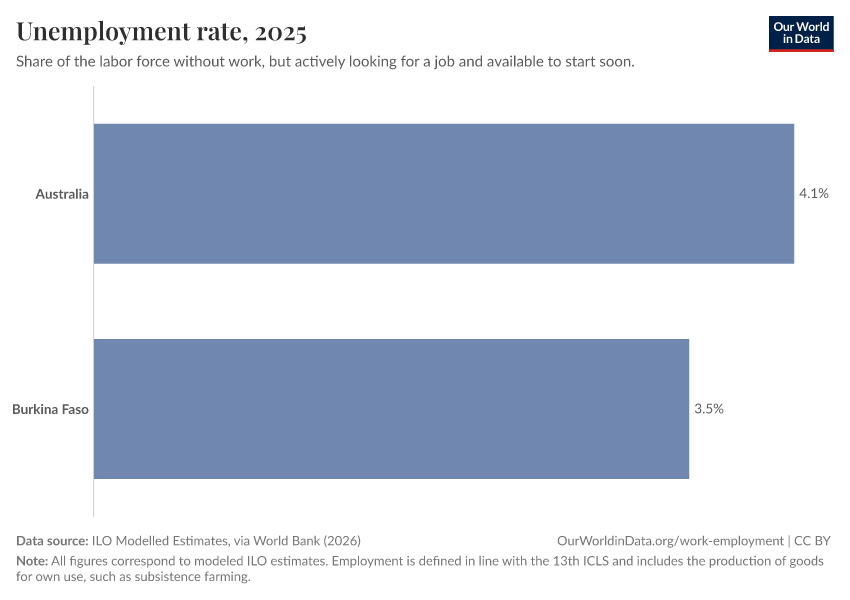 ILO Modelled Estimates, via World Bank (2026) – processed by Our World in Data. “Unemployment rate – ILO” [dataset]. ILO Modelled Estimates, via World Bank, “World Development Indicators 125” [original data]. Retrieved March 13, 2026 from https://admin-refresh-dis.owid.pages.dev/grapher/unemployment-rate