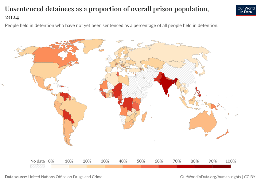 United Nations Office on Drugs and Crime – processed by Our World in Data. “Unsentenced detainees as a proportion of overall prison population” [dataset]. United Nations Office on Drugs and Crime, “UNODC calculations based on national data” [original data]. Retrieved March 13, 2026 from https://admin-refresh-dis.owid.pages.dev/grapher/unsentenced-detainees-as-proportion-of-prison-population