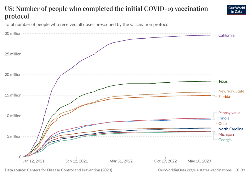 Centers for Disease Control and Prevention (2023) – processed by Our World in Data. “US: Number of people who completed the initial COVID-19 vaccination protocol” [dataset]. Centers for Disease Control and Prevention, “COVID-19, Vaccinations (United States)” [original data]. Retrieved March 13, 2026 from https://admin-refresh-dis.owid.pages.dev/grapher/us-covid-number-fully-vaccinated