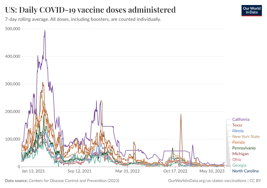 Centers for Disease Control and Prevention (2023) – processed by Our World in Data. “US: Daily COVID-19 vaccine doses administered” [dataset]. Centers for Disease Control and Prevention, “COVID-19, Vaccinations (United States)” [original data]. Retrieved March 13, 2026 from https://admin-refresh-dis.owid.pages.dev/grapher/us-daily-covid-vaccine-doses-administered