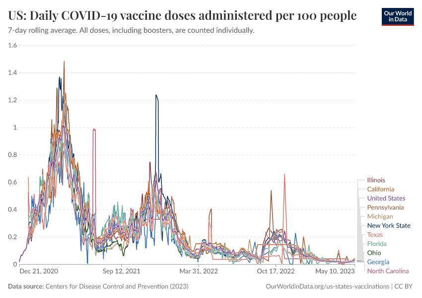 Centers for Disease Control and Prevention (2023) – processed by Our World in Data. “US: Daily COVID-19 vaccine doses administered per 100 people” [dataset]. Centers for Disease Control and Prevention, “COVID-19, Vaccinations (United States)” [original data]. Retrieved March 13, 2026 from https://admin-refresh-dis.owid.pages.dev/grapher/us-daily-covid-vaccine-doses-per-100