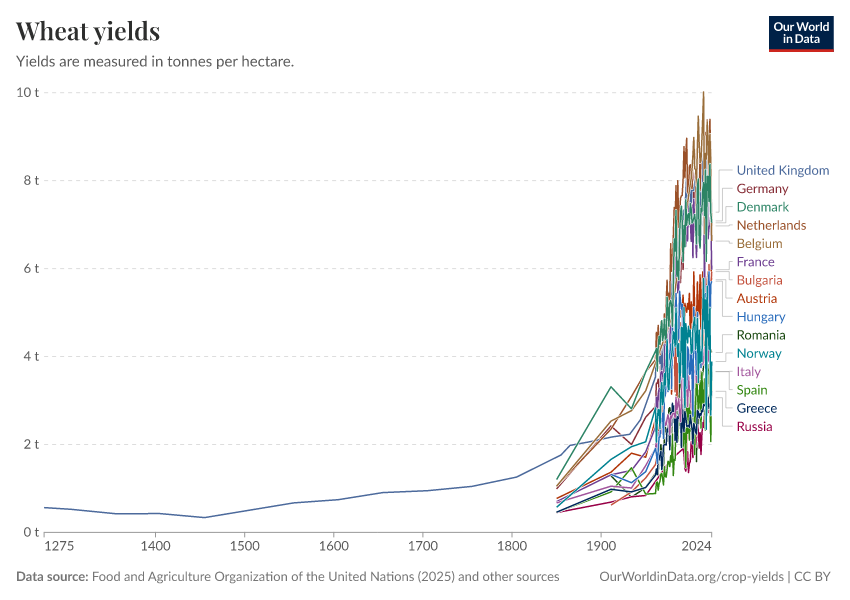 Food and Agriculture Organization of the United Nations (2025); Broadberry et al. (2015); Brassley (2000); Bayliss-Smith & Wanmali (1984) – with major processing by Our World in Data. “Wheat yields” [dataset]. Food and Agriculture Organization of the United Nations, “Production: Crops and livestock products”; Broadberry et al., “Long-term crop yields in UK”; Brassley, “Long-term crop yields in UK”; Bayliss-Smith & Wanmali, “Understanding Green Revolutions” [original data]. Retrieved March 13, 2026 from https://admin-refresh-dis.owid.pages.dev/grapher/wheat-yields