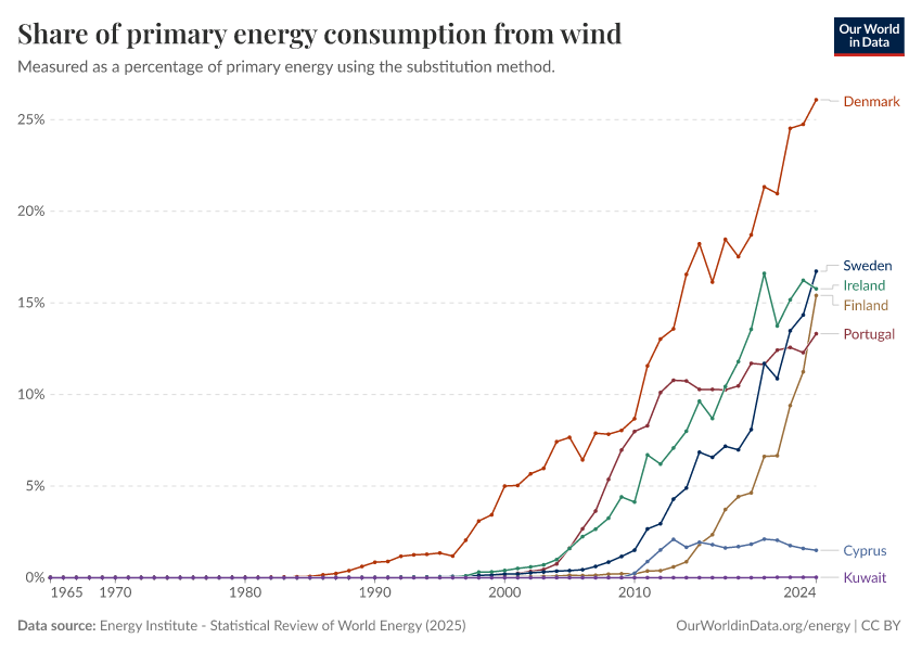 Energy Institute - Statistical Review of World Energy (2025) – with major processing by Our World in Data. “Share of primary energy consumption that comes from wind power – Using the substitution method” [dataset]. Energy Institute, “Statistical Review of World Energy” [original data]. Retrieved March 13, 2026 from https://admin-refresh-dis.owid.pages.dev/grapher/wind-share-energy