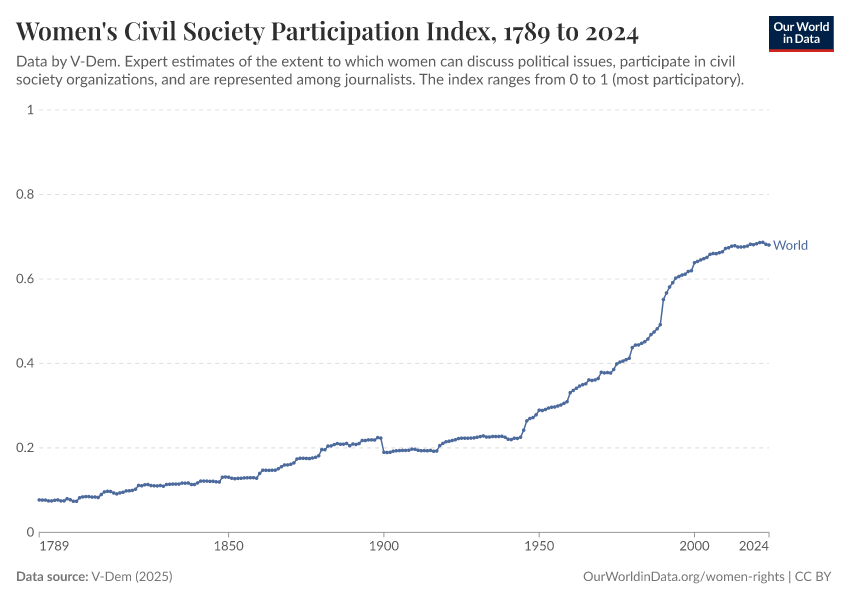“Data Page: Women's civil society participation index”, part of the following publication: Bastian Herre, Lucas Rodés-Guirao, and Esteban Ortiz-Ospina (2013) - “Democracy”. Data adapted from V-Dem. Retrieved from https://admin-refresh-dis.owid.pages.dev/grapher/women-civil-society-participation-index [online resource]How to cite this data