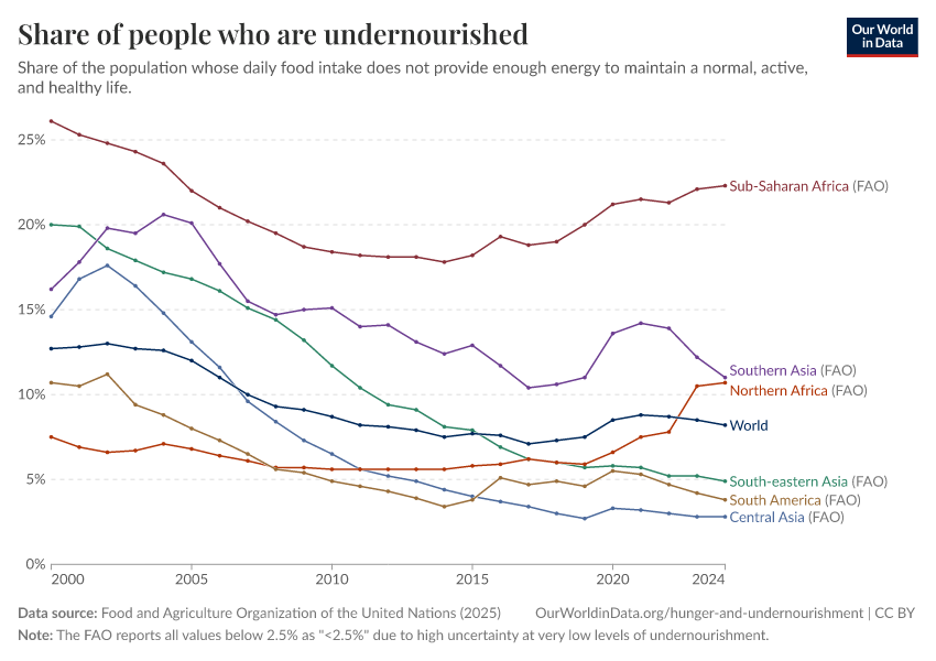 Hannah Ritchie, Pablo Rosado, and Max Roser (2023) - “Hunger and Undernourishment” Published online at OurWorldinData.org. Retrieved from: 'https://admin-refresh-dis.owid.pages.dev/hunger-and-undernourishment' [Online Resource]BibTeX citation