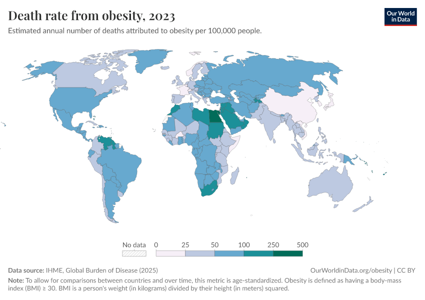 In the map here you can see differences in death rates from obesity across the world, per 100,000 people in the population.