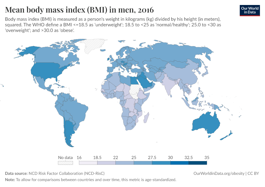 In the map here we see the distribution of mean BMI for adult men across the world.