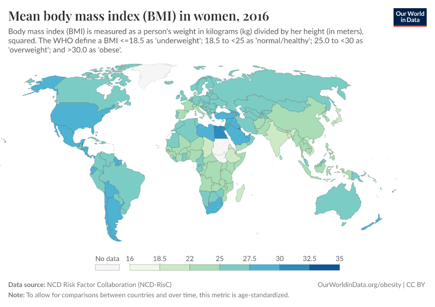 In 2016, the global average (mean) BMI in women was around 25, which is the cut-off for overweight. The average BMI tends to be higher in North and South America and North Africa, and lower in sub-Saharan Africa and Asia.