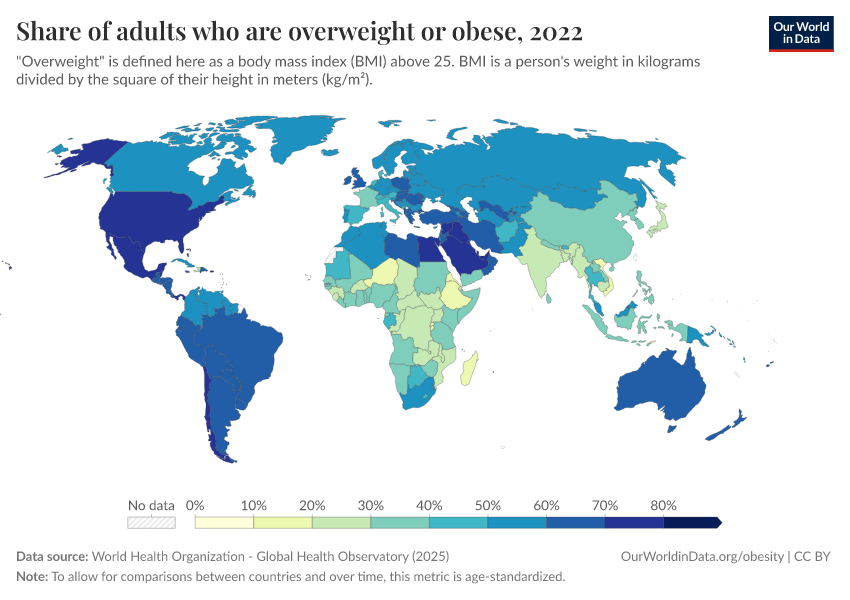 In the map here we see the share of adults who are overweight or obese across countries.