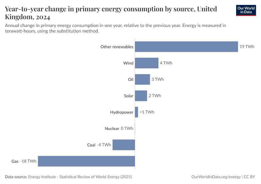 This interactive chart shows the change in primary energy consumption from these sources each year. A positive figure means the country consumed more energy from that source than the previous year; a negative means it consumed less.