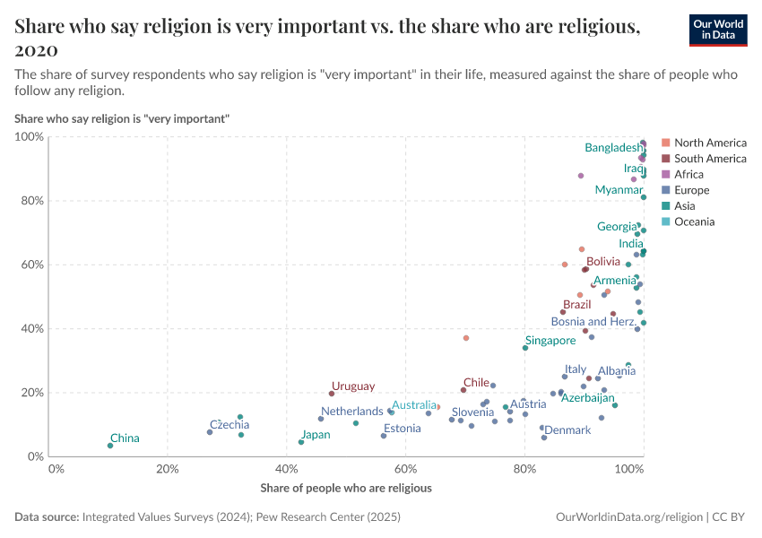 In the scatterplot, you can see these two metrics plotted against each other.6 There is a very clear and strong relationship, but with interesting regional patterns. Many European countries have high rates of affiliation, but very few people consider it to be very important to them. Take Denmark as an example. More than 80% of Danes say that they are religious, but only 5% say it’s “very important”.