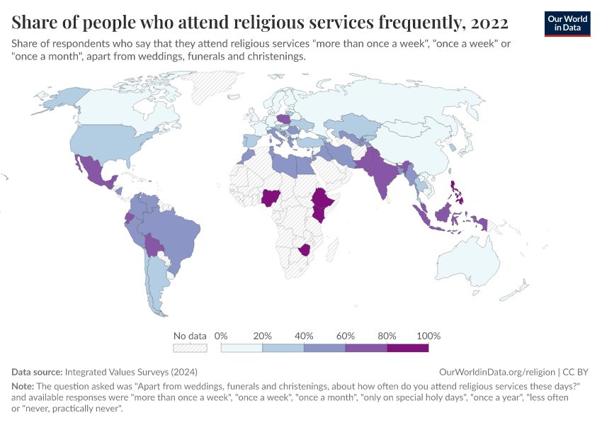 That’s what the data on religious affiliation in this section captures. It relies on survey and census responses. Someone is described as being religious or non-religious based on their self-identification. If they report in a survey that they are Christian, Muslim, or Hindu, this is what is recorded, regardless of their actual practices or specific beliefs.