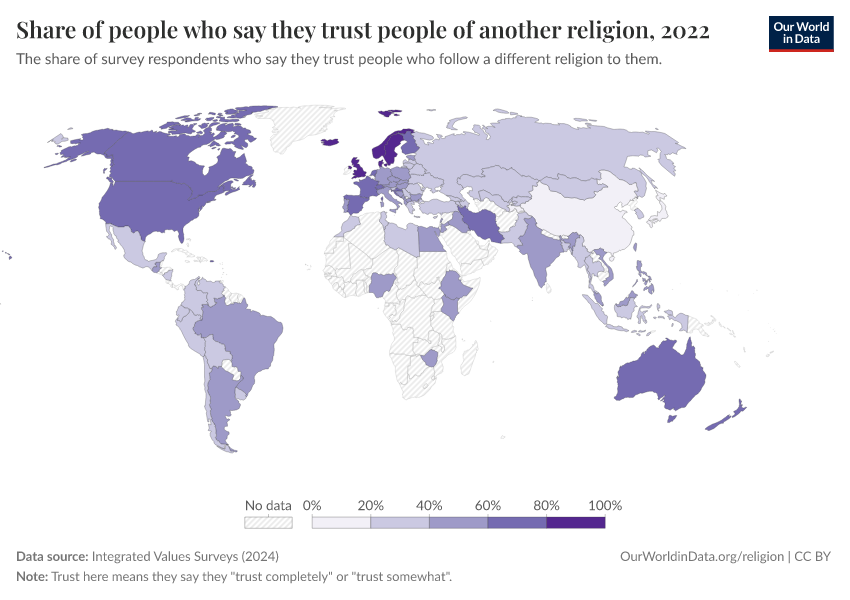 The chart below shows the share of people who say that they “trust completely” or “trust somewhat” people of another religion.