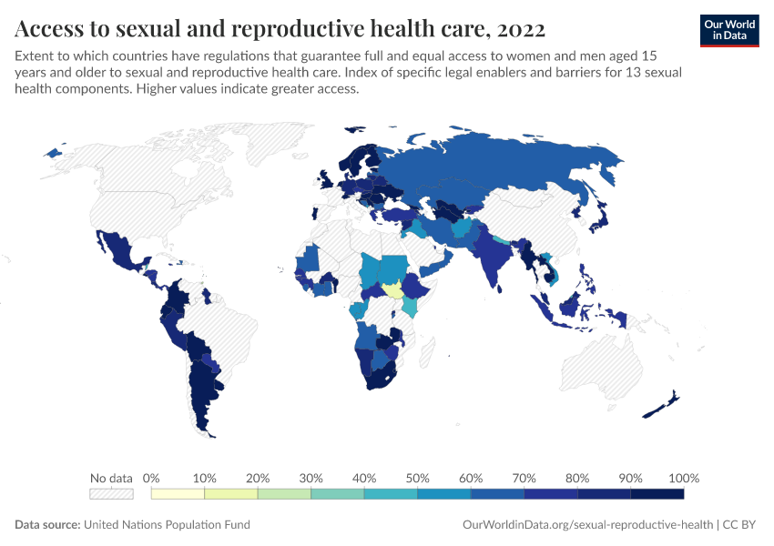 The interactive visualization shows the extent to which a given country has laws and regulations that guarantee full and equal access to women and men aged 15 years and older to sexual and reproductive health care, information and education. The score for each country is calculated based on 13 components, including access to maternity care and contraception. This measure focuses only on the presence of laws and regulations, not the extent of their implementation.