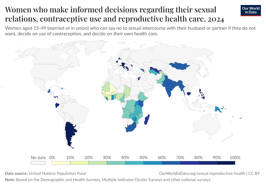 This is shown here as the percentage of women aged 15-49 years old that are married or in union who make their own informed decisions regarding sexual relations and reproductive healthcare.