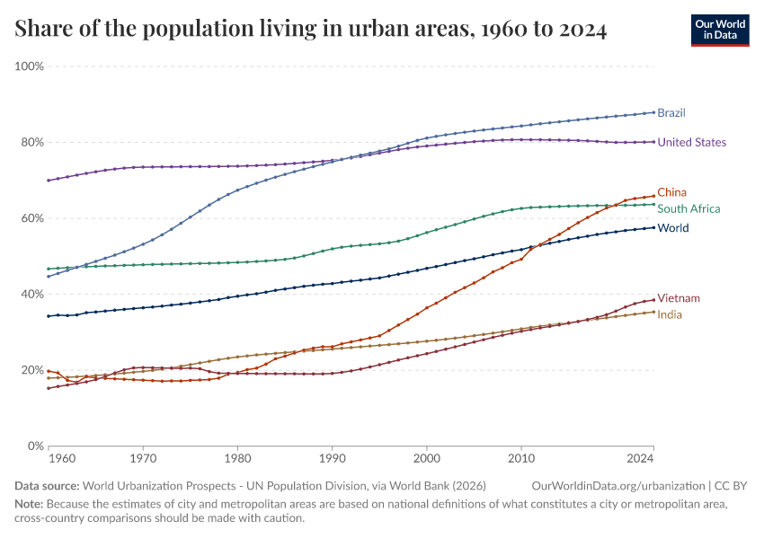 Hannah Ritchie, Veronika Samborska, and Max Roser (2024) - “Urbanization” Published online at OurWorldinData.org. Retrieved from: 'https://admin-refresh-dis.owid.pages.dev/urbanization' [Online Resource]BibTeX citation