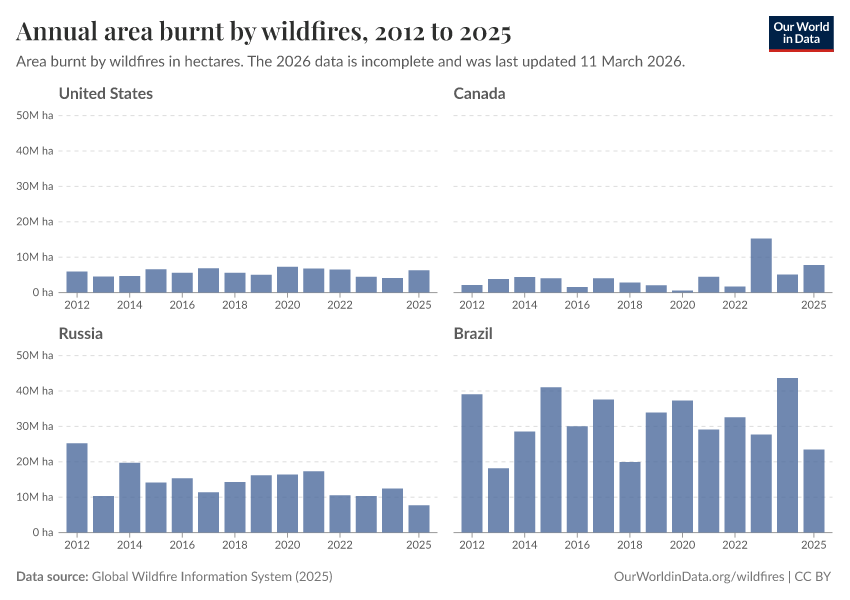 Veronika Samborska and Hannah Ritchie (2024) - “Wildfires” Published online at OurWorldinData.org. Retrieved from: 'https://admin-refresh-dis.owid.pages.dev/wildfires' [Online Resource]BibTeX citation