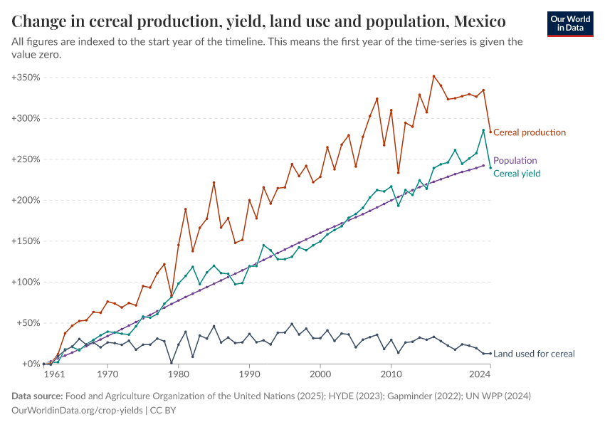 In the chart below we see cereal production, land use and yield trends for Mexico over the period from 1961. Mexico was one of the first countries to be linked to the Green Revolution of the 20th century.1